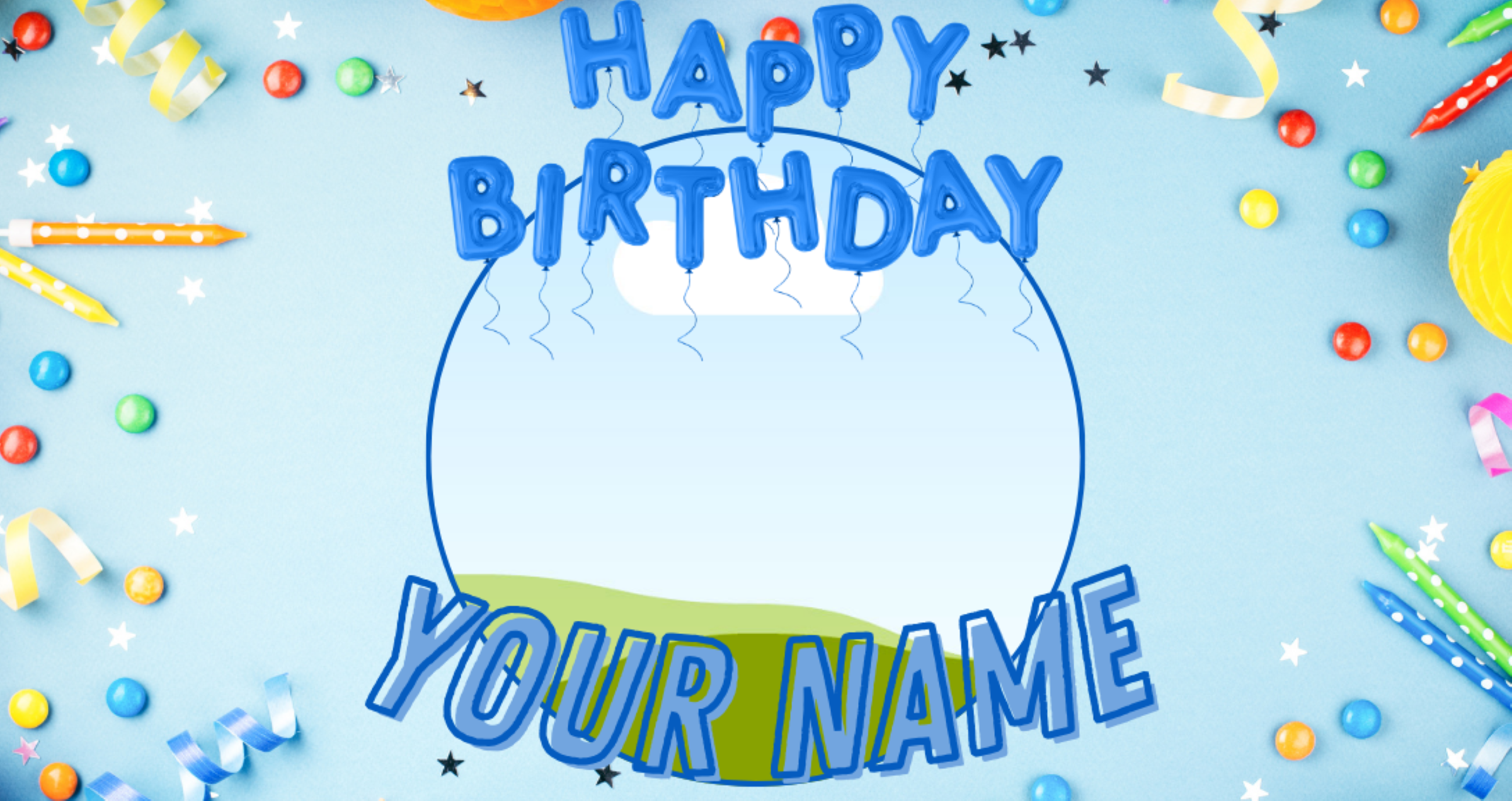 Celebrate with a burst of blue! This cheerful background features festive balloon lettering and colorful party decor—perfect for making your birthday message pop on the big screen.